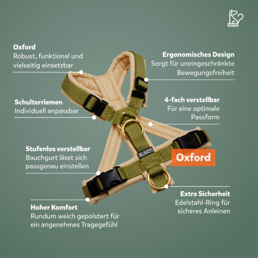 Individuell konfigurierbares Y-Oxford-Hundegeschirr für stabile Alltagstauglichkeit, stilvolle Optik und angenehmen Tragekomfort.