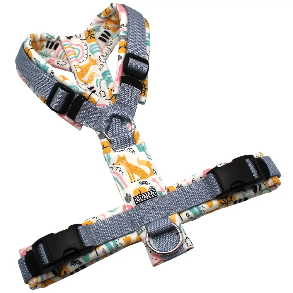 BUMER Hundegeschirr, gepolstert ohne geteiltem Bruststeg, Größe M, Gurtband: PREMIUM X Silbergrau, Softshell: Waldtiere #12, Ringe: silberfarbig (Edelstahl), Schnallen: schwarz (DURAFLEX®), Applikation